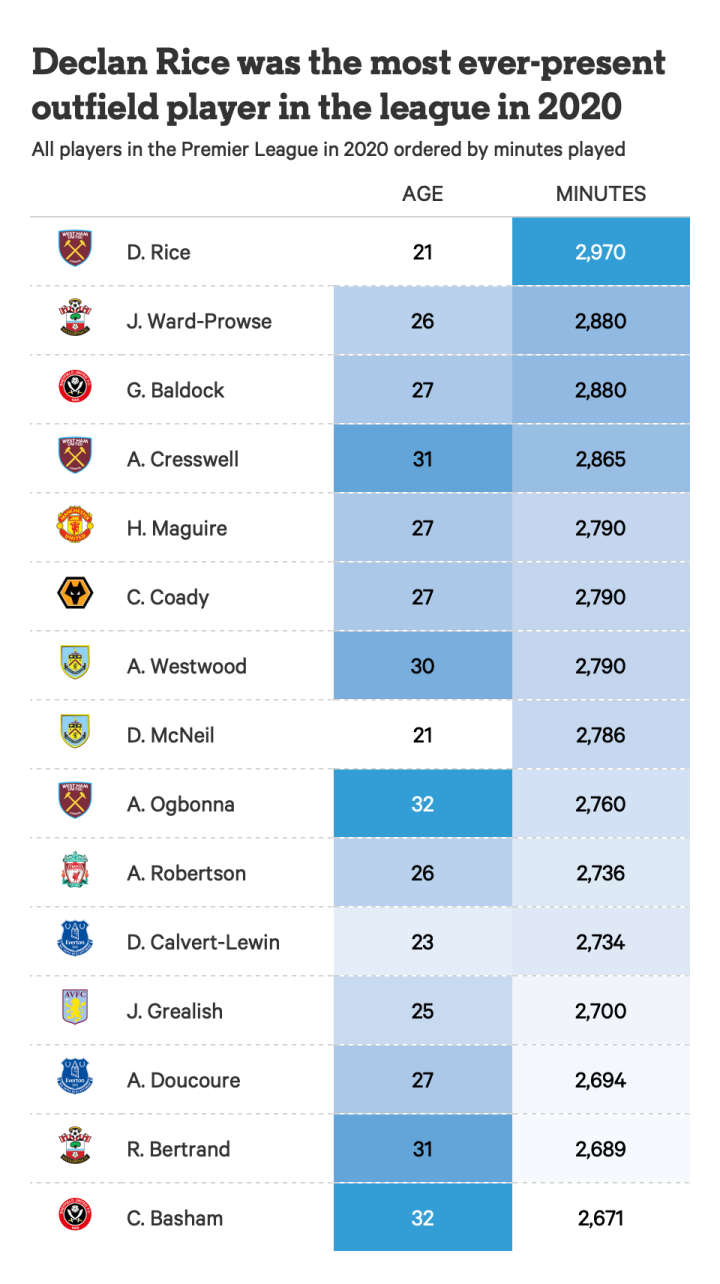 尽管只有21岁,但赖斯是2020年英超联赛中出场时间最多的球员。这在我们看来很不可思议,但也印证了他是整个欧洲同龄人中最有比赛经验的球员。与赖斯一起上榜的还有队友奥邦纳和克雷斯维尔,这三人是大卫-莫耶斯一直倚重的球员。