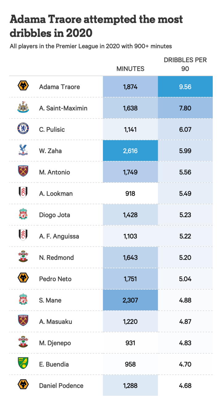 这个榜单可以说是争议最小的,阿达玛-特拉奥雷是2020年每90次尝试带球最多的球员。