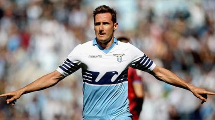 33岁的克洛泽以自由球员的身份加盟意甲劲旅拉齐奥队,开始了职业生涯第一次出国修行。2013年5月意甲第35轮,拉齐奥主场6-0大胜博洛尼亚,35岁的克洛泽首发登场上演五子登科,比赛前18分钟就上演帽子戏法、40分钟内打入5球,一举创欧洲五大联赛历史最快单场五球记录 ,更是自意甲三分制以来首位在单场比赛中打进5球的球员,也是1986年意甲27年来首位独中五元的球员,更是意甲长达50年以来首位单场运动战进球达到5球的球员。 2014年世界杯半决赛,36岁的K神给了我们最好的世界杯记忆。德国队7-1战胜巴西,在那场让人印象深刻的比赛中,克洛泽打进自己世界杯正赛的第16球,打破了罗纳尔多的世界杯历史最佳射手纪录,官方字幕条上打出:“世界杯历史最佳射手”的字样,36岁的“足坛高龄”打破纪录成为世界杯历史上进球最多的球员,这应该是克洛泽在足球史上留下的最浓墨重彩的一笔。当空翻后的克洛泽没有站稳一屁股坐在了草地上,让人感叹岁月催人老,K神难再翻!