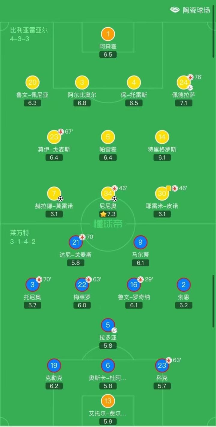 比利亚雷亚尔首发:1-阿森霍、20-鲁文-佩尼亚、3-阿尔比奥尔、4-保-托雷斯、24-佩德拉萨(76′21-豪梅-科斯塔)、14-特里格罗斯、5-帕雷霍、23-莫伊-戈麦斯(67′15-埃斯图皮尼安)、7-赫拉德-莫雷诺、34-尼尼奥(46′8-福伊特)、30-耶雷米-皮诺(46′11-楚克乌泽)