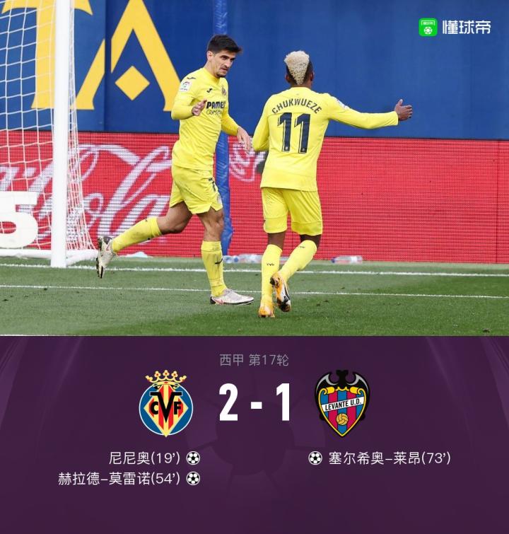 比利亚雷亚尔2-1莱万特,尼尼奥首开纪录,莱昂收获赛季首球