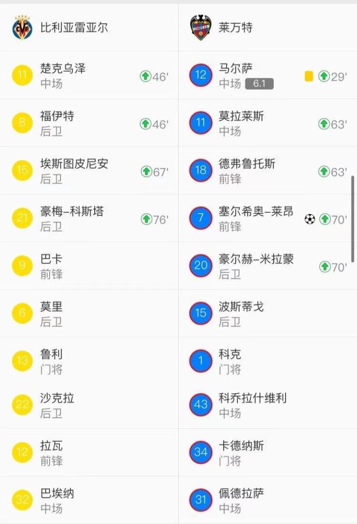 莱万特首发:13-艾托尔-费尔南德斯、3-托尼奥(71′20-豪尔赫-米拉蒙)、6-奥斯卡-杜阿尔特、23-科克(63′11-莫拉莱斯)、2-索恩、19-克勒克、22-梅莱罗(63′18-德弗鲁托斯)、5-拉多亚、16-鲁文-罗奇纳(29′12-马尔萨)、21-达尼-戈麦斯(70′7-塞尔希奥-莱昂)、9-马尔蒂