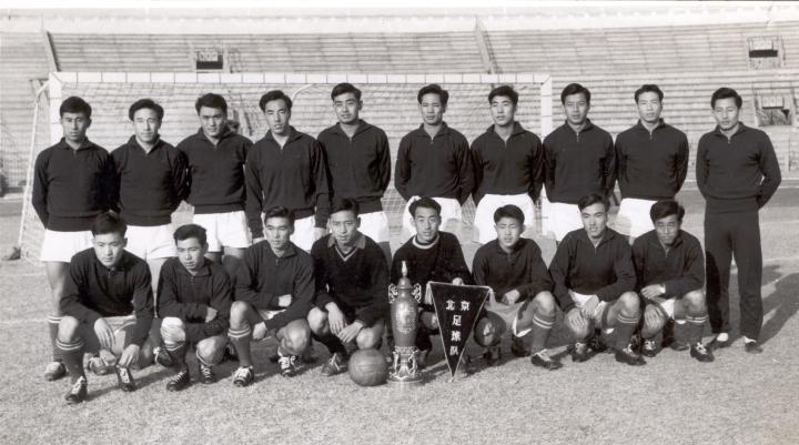 (1957年北京足球队获得中国第一个甲级联赛冠军,站立排右3张宏根,一排右4张俊秀,一排左2张京天)