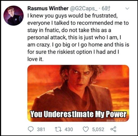 作为LEC赛区冉冉升起的新星,Caps对欧美俱乐部的吸引力就如同朝九晚五、年薪百万、一环有房的年轻小伙子在海淀公园相亲角一样,令人朝思暮想。而最终他的决定如同一记重磅的深水炸弹,引爆了欧美赛区的舆论圈:加入FNC的死敌——G2。