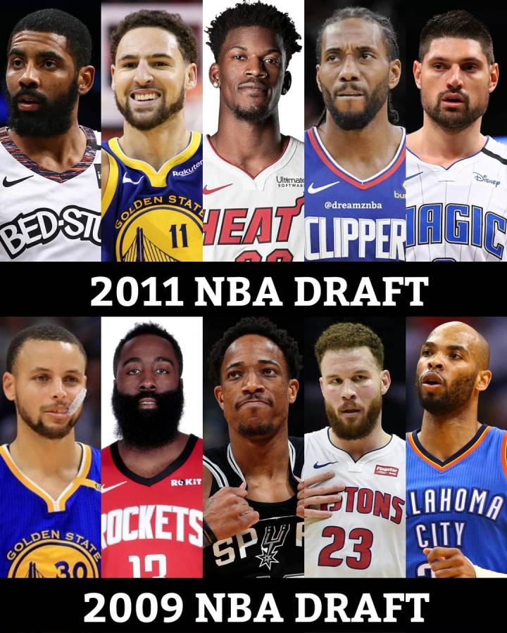 当然除了上面提到的3届选秀,还有其他年份的选秀,依旧涌现出了很多实力不俗的球星。近日美国媒体晒出一张图片,问到谁会取得最后的胜利?图片上是2009年选秀大会中比较出色的球员,分别是:库里、哈登、德罗赞、格里芬、吉布森;他们的对手是2011年选秀大会的优秀球员。分别是:欧文、克莱-汤普森、巴特勒、莱昂纳德、武切维奇。
