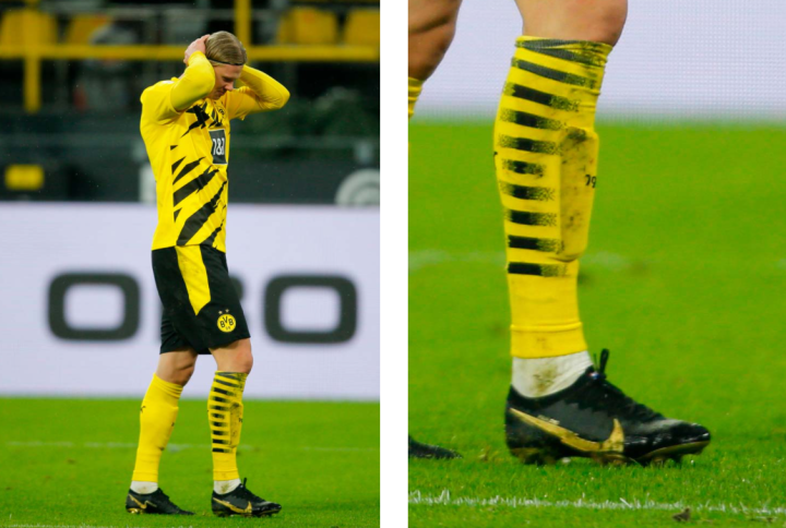为了纪念他最近获得的金童奖,耐克给哈兰德送上了一双特别定制的刺客,这双鞋的特点是黑色的底色加上金色的装饰,让人想起2019年的 "Black Lux"套装。在本周末多特蒙德2-0战胜沃尔夫斯堡的比赛中,挪威人穿上了它们。