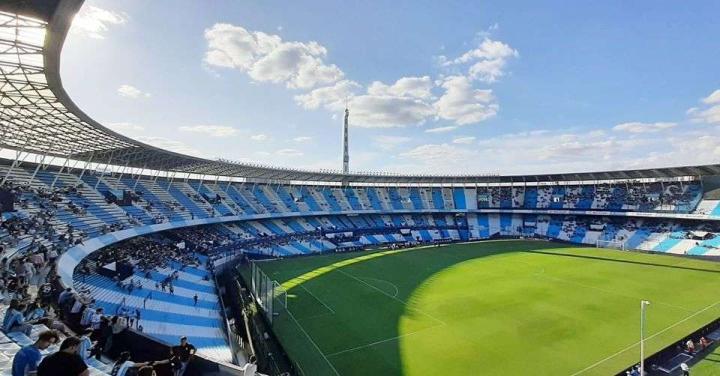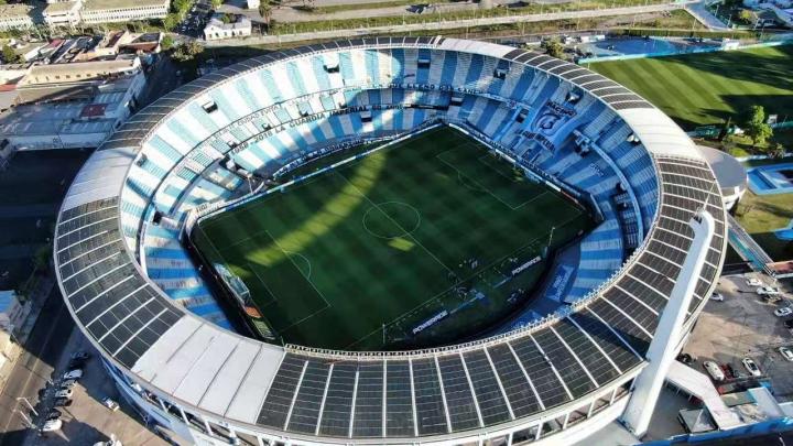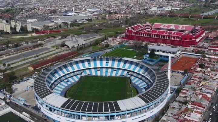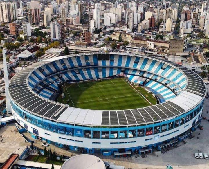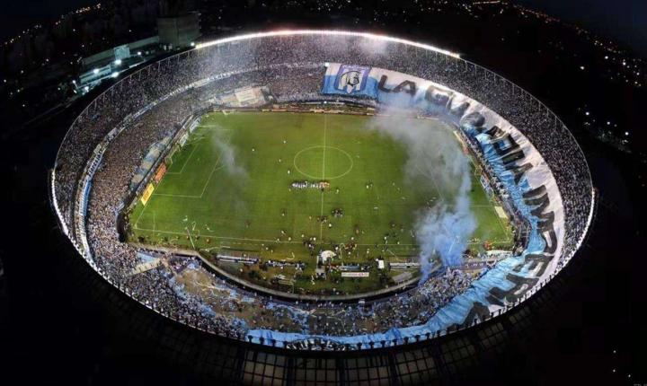 18. 竞技俱乐部(Racing Club de Avellaneda)主场贝隆总统体育场(Estadio Presidente Perón) 竞技俱乐部主场贝隆总统体育场位于布宜诺斯艾利斯市郊阿韦亚内达大区,行政区域划分归属于布宜诺斯艾利斯省。因为其外形特征,别称“圆柱体球场”,由德国建筑师设计,于1950年9月3日正式启用。 1946年,在时任阿根廷总统贝隆的推动下,俱乐部获得融资后启动球场重建工程,并决定以贝隆总统命名球场。建成初期,看台多为站席,球场容量较大。1967年,竞技队在洲际俱乐部杯次回合比赛主场迎战苏超凯尔特人的比赛中,球场内创纪录地涌入了12万名观众。1997年,俱乐部完成了球场的顶棚加盖工程,贝隆总统体育场成为阿根廷首座主看台全顶棚覆盖的球场。1946年,在时任阿根廷总统贝隆的推动下,俱乐部获得融资后启动球场重建工程,并决定以贝隆总统命名球场。建成初期,看台多为站席,球场容量较大。1967年,竞技队在洲际俱乐部杯次回合比赛主场迎战苏超凯尔特人的比赛中,球场内创纪录地涌入了12万名观众。1997年,俱乐部完成了球场的顶棚加盖工程,贝隆总统体育场成为阿根廷首座主看台全顶棚覆盖的球场。 随着对看台的逐步改造,球场目前可容纳60000名观众。2014年,竞技队在联赛最后一轮以1比0战胜戈多伊克鲁斯并最终夺冠的比赛中,时隔多年后球场再次爆满,超过60000万观众在现场与球队一同庆祝夺冠。2020年,俱乐部又提出了一个投资约2000万美元的球场现代化翻新计划。 由于阿韦亚内达大区人口密集,土地有限,只在罗卡铁路线由南向东的转弯处有一片空地可以用来修建球场,这也成就了竞技队和独立队同城德比主场仅相邻300米的奇观。两队都拥有庞大的球迷数量,且都在历史上取得过辉煌的成绩,彼此之间的比赛被视为阿根廷第二国家德比。