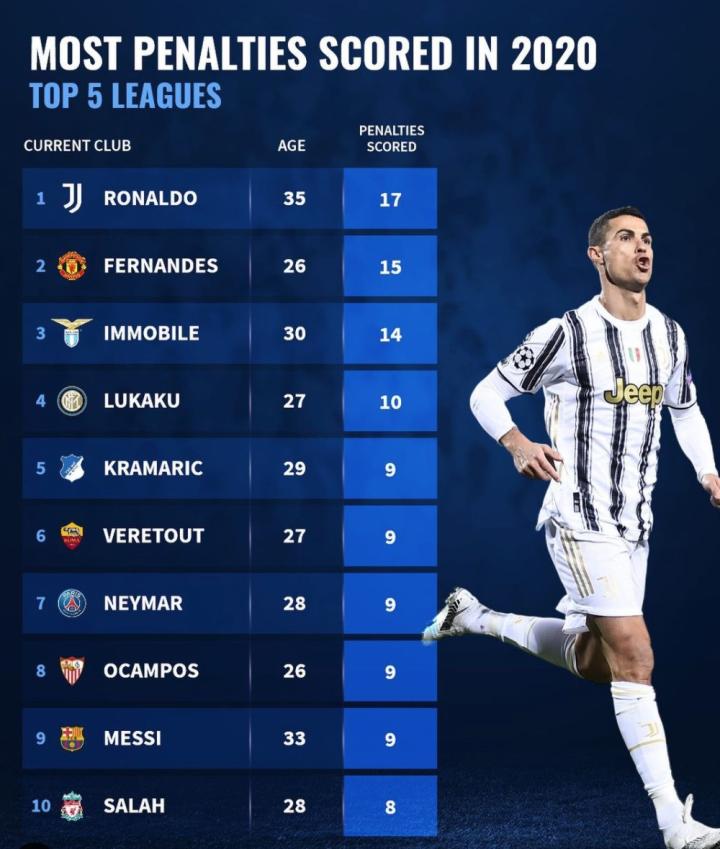 德国转会市场统计了2020年五大联赛的点球进球榜,C罗以17次点球主罚命中排在第一。