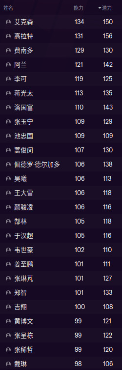 此外,中国球员PA值最高的球员分别是(130及以上的):高拉特156、艾克森150、洛国富143、阿兰142、德尔加多138、黄紫昌(CA-81)138、郭彤(上港18岁门将,)135、侯永永135、蒋光太135、刘若钒(CA-76)134、郑智133、于大宝131、费南多130、博琰贾(上港16岁中场小将)130、蒿俊闵130和王永珀130。