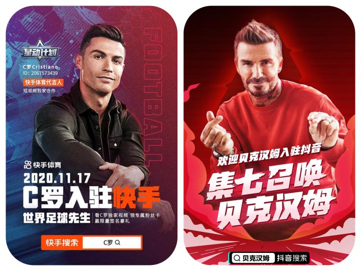2020年8月26日、农历“七夕”节,传奇七号小贝入驻抖音平台。根据抖音官方公布的数据,贝克汉姆入驻首日涨粉115万,浏览量超过3000万。入驻首日,抖音发起了#集七召唤贝克汉姆挑战赛的活动,该话题收获了5.6亿次的播放量。而快手也不甘落后,11月17日,快手宣布C罗入驻平台,而快手给到C罗的资源位也将是平台最高的级别。