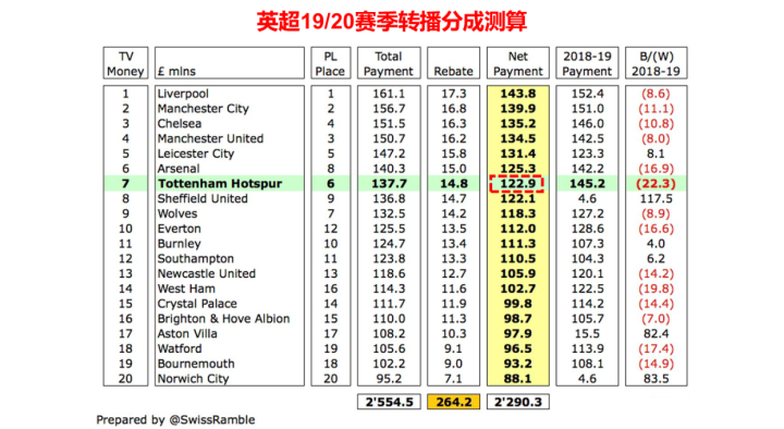 英超至今未官方公布19/20赛季转播分成,根据足球财务专家Swiss Ramble计算,上赛季排名第六的热刺收到英超转播分成约1.23亿英镑(扣除因延期而返还转播商的金额),低于排名第八的阿森纳,比冠军利物浦少拿2,090万,剩余部分收入将在20/21财年体现。