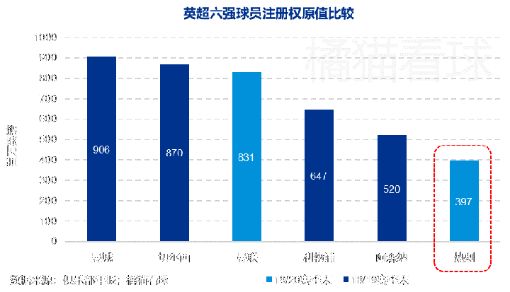 球员注册权原值是衡量现有阵容构建成本最准确的指标。截至去年六月,热刺的建队成本只有3.97亿英镑,连曼城、切尔西和曼联的一半都不到。与此同时,根据德国转会市场网,一线队的阵容身价总和却高达7.26亿英镑,真可谓“花小钱,办大事”。