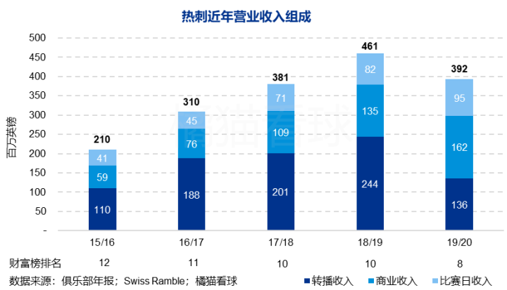新球场落成的重大意义还体现在直接相关的比赛日收入上,19/20财年热刺的该项收入增长到9,500万英镑,超越了曼联的9,000万,不出意外将成为上赛季比赛日收入最高的球队。