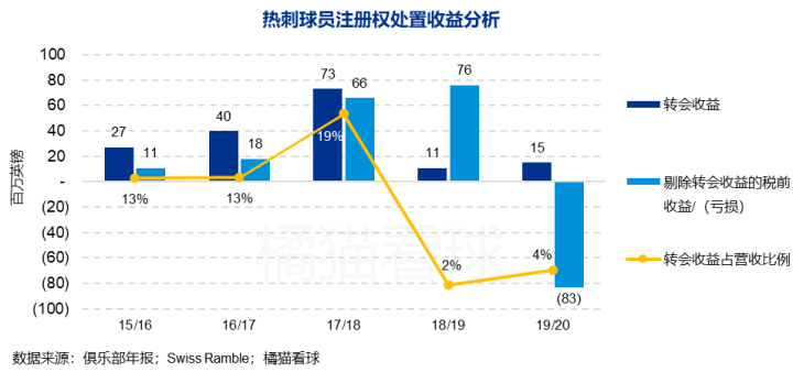 同样的结论在报表上也有所体现,新球场落成后,现金流方面更有底气的热刺球员注册权处置收益骤减,占营收的比重也下降到了可以忽略不计的程度。