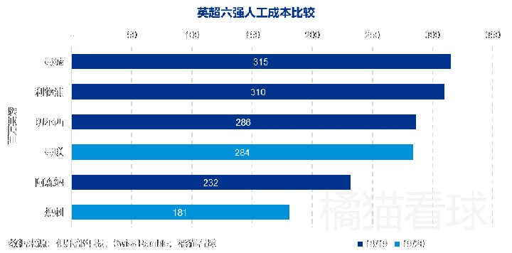 18/19财年,热刺的人工成本远远落后于其他五强,仅仅是曼联3.32亿英镑的54%。19/20财年,曼联工资支出大幅下降,热刺薪资水平则略有提升,但仍然只有红魔64%的水平。