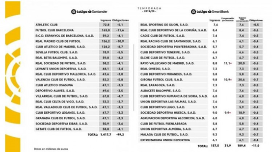 1、近日,西甲联盟官方公布了2019-20赛季的电视转播收入分配,巴萨1.65亿欧居首,皇马1.562亿第二,马竞1.242亿第三,巴伦西亚8220万欧元位列西甲第四。{直播吧}