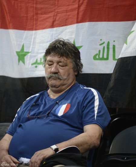 欧洲杯首轮最后一组的焦点战,两队拥有众多英超球员,本以为是刺刀对刺刀的精彩比赛,然而两队在上半场进球之后,比赛完全陷入平静的状态,英格兰人在自己的后场玩起了倒脚,而法国人非常默契、非常配合的懒洋洋的在前场象征性逼抢,这位大叔的经典照片成为了场上比赛最好的缩影。
