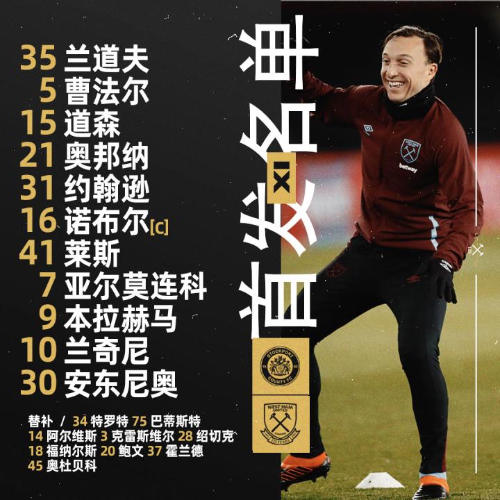 首发公布丨斯托克波特郡 vs 西汉姆联 决战足总杯,我们目标下一轮!