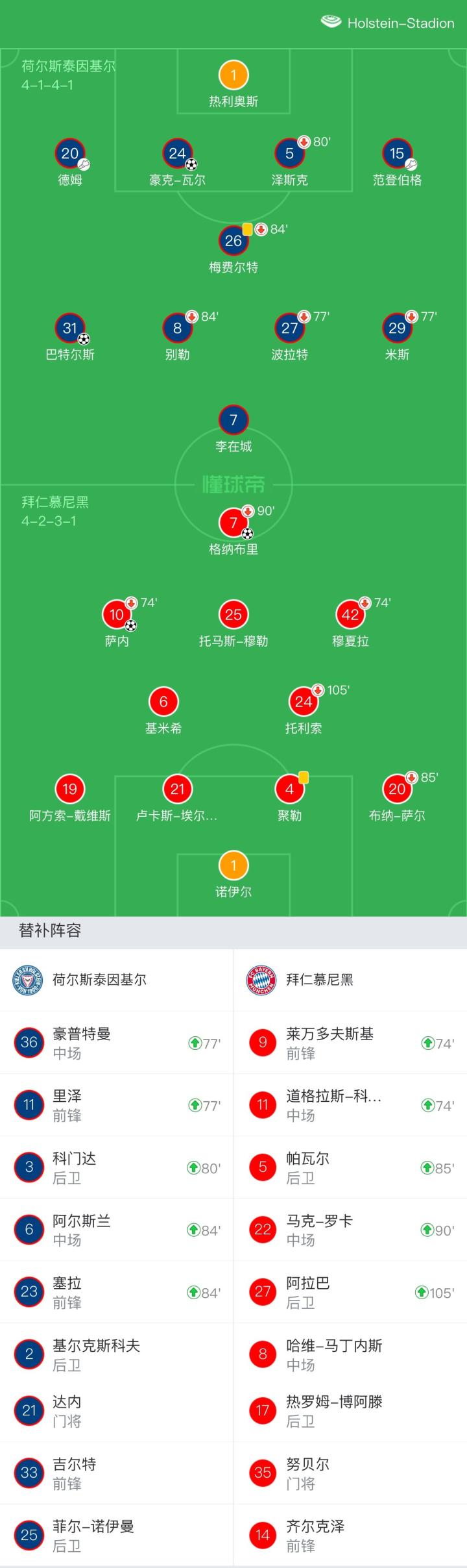 拜仁首发:1-诺伊尔、20-萨尔(85`5-帕瓦尔)、4-聚勒、6-基米希、21-卢卡斯-埃尔南德斯、19-阿方索-戴维斯、24-托利索(105`27-阿拉巴)、7-格纳布里(90`22-罗卡)、25-托马斯-穆勒、42-穆夏拉(74`9-莱万多夫斯基)、10-萨内(74`11-科斯塔)
