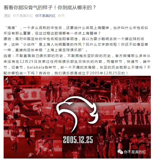 逃避:不敢直面自己俱乐部的历史,不敢拥抱东亚阶段的历史,官方微博那么多年从来没有在12月25日发表过任何祝俱乐部生日快乐的内容,而植树节,快递节,端午节,记者节,balabala各种节,却一个不漏的发海报,东亚的历史就那么不堪吗?不配你哪怕说一下吗?告诉你,我们俱乐部是成立于2005年12月25日的!