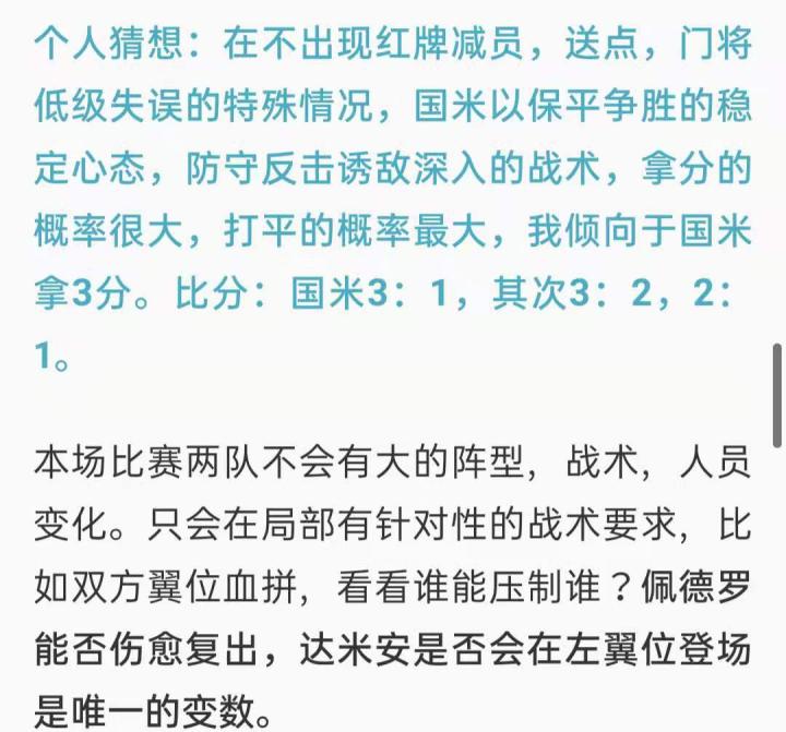 娱乐性个人猜想:在不出现红牌减员,送点,门将低级失误的特殊情况,国米拿分的概率很大,打平的概率最大。我倾向于国米拿3分。比分:国米2:1,其次2:2,2:0。
