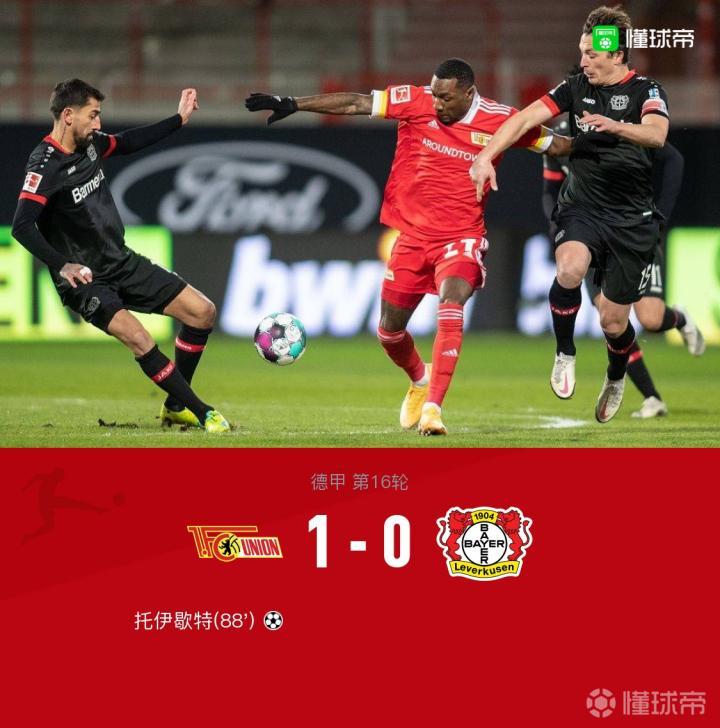 北京时间1月16日3:30,德甲联赛第16轮,柏林联合坐镇主场,迎战勒沃库森。上半场,弗里德里希造险,贝克尔伤退,柏林联合暂时0-0勒沃库森;下半场,托伊歇特中柱,最后时刻兰茨助攻托伊歇特单刀破门,完成绝杀。最终柏林联合1-0战胜勒沃库森。