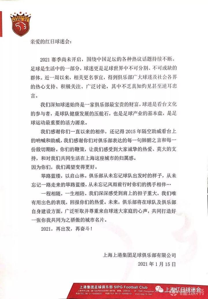 同时,我们还希望俱乐部像在信中所说的一样,把球迷当作俱乐部的宝贵财富,积极听取球迷意见和建议,不遮遮掩掩、不避重就轻,不以讲道理代替摆问题,有勇于改进自身不足的魄力。我们愿与俱乐部一起努力,在赛场内外展现上海球队、上海球迷的风采,进一步提升球队球迷认同感、归属感,加强球迷文化建设,为打造百年俱乐部迈出坚实的一步。