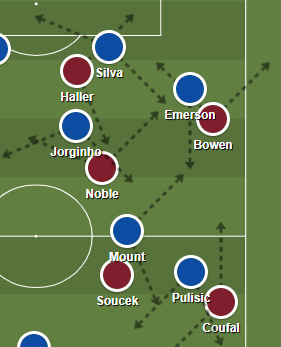 简而言之,兰帕德崇尚攻势足球,偏向于中路细腻的推进、边路中路的积极衔接、对肋部和弧顶的利用、倾向于让边卫前插助攻,选取的中场球员除单后腰外有着不错的远射能力和前插得分意识(和他的球风有密切联系;