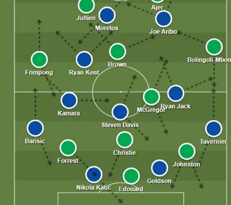 上赛季面对连冠多年的苏超班霸凯尔特人(上图),杰拉德利用了前锋莫雷洛斯和阿里波出色的前场拼抢和争顶能力,配合中场球员对边后卫的保护、利物浦青训肯特的积极回防,成功笑傲老字号德比;
