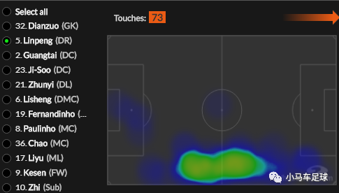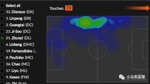 (同场比赛中,张琳芃的热点图比高准翼的热点图更靠近对方禁区)