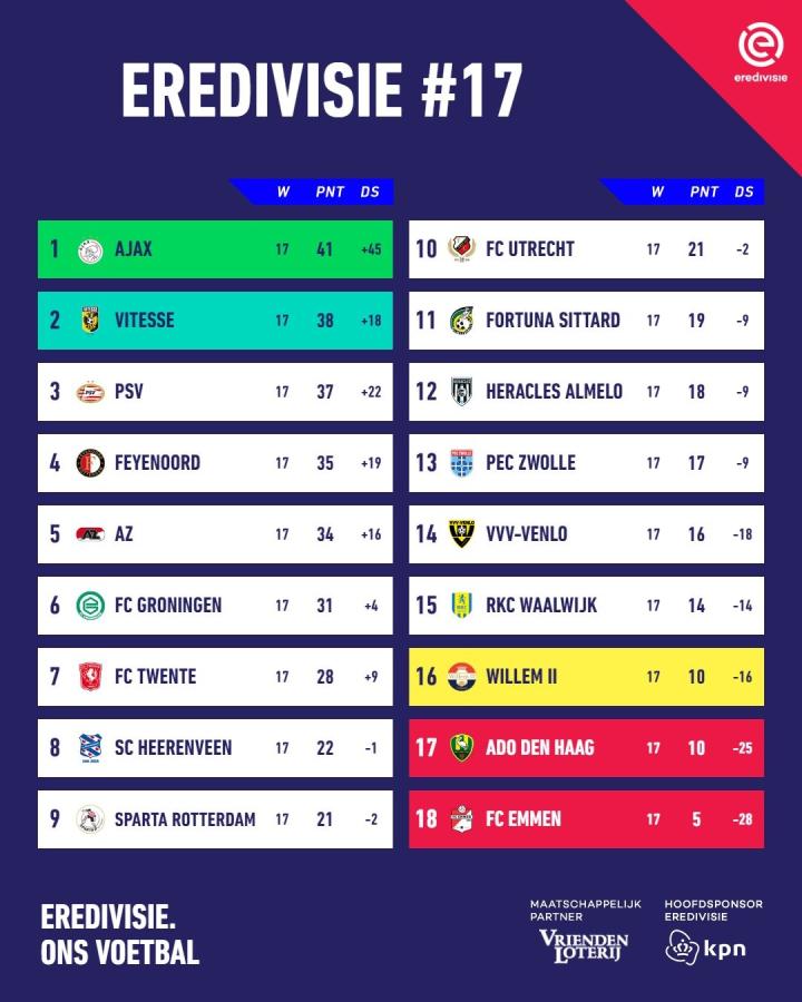 北京时间1月18日,荷甲联赛第17轮的争夺全部结束。阿贾克斯主场1-0力克费耶诺德,继续位居榜首;PSV埃因霍温客场5-3逆转鹿特丹斯巴达;阿尔克马尔逆转绝杀海牙;格罗宁根2-2和特温特握手言和。