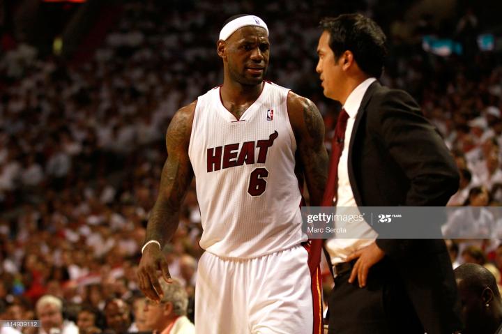 2010年休赛期,詹姆斯将天赋带到南海岸,加盟热火,和韦德、波什组成三巨头。2011年东决,詹姆斯率热火淘汰了该赛季夺走MVP的罗斯领军的公牛,但在总决赛中不敌独行侠。此后,詹姆斯实现技术进化,在2012和2013年率热火连夺2冠,他也再次蝉联MVP。(仰卧撑/毛毛)