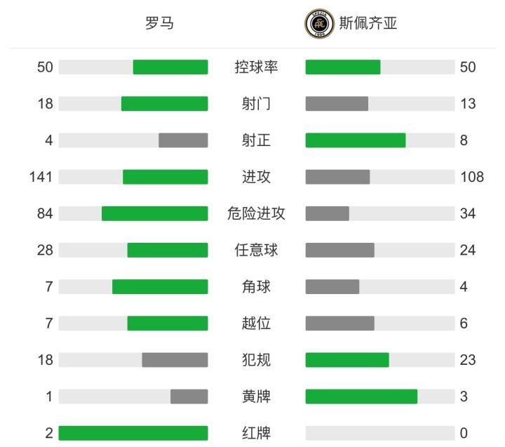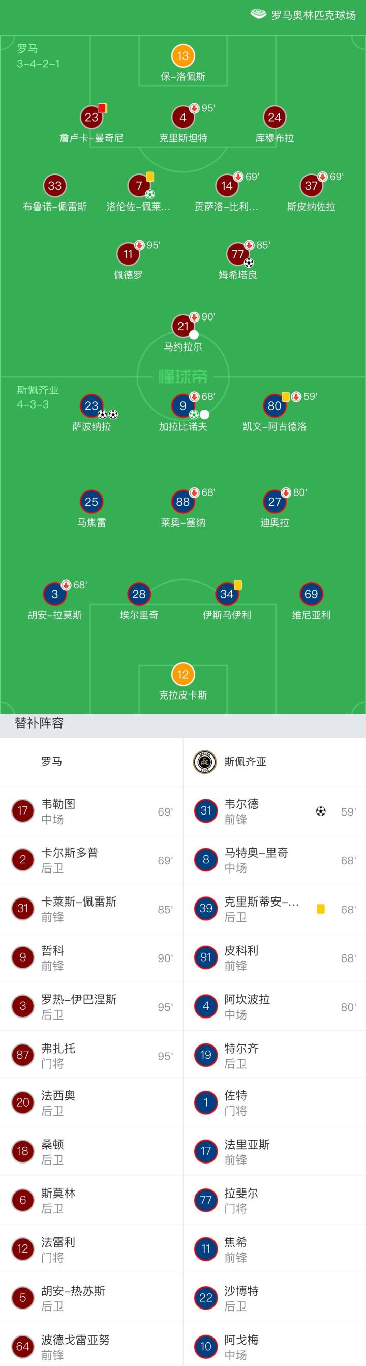 罗马首发:13-保-洛佩斯、23-曼奇尼、4-克里斯坦特(95`87-弗扎托)、24-库穆布拉、33-布鲁诺-佩雷斯、7-佩莱格里尼、14-比利亚尔(69`17-韦勒图)、37-斯皮纳佐拉(69`2-卡尔斯多普)、11-佩德罗(95`3-罗热-伊巴涅斯)、77-姆希塔良(85`31-卡莱斯-佩雷斯)、21-马约拉尔(90`9-哲科)