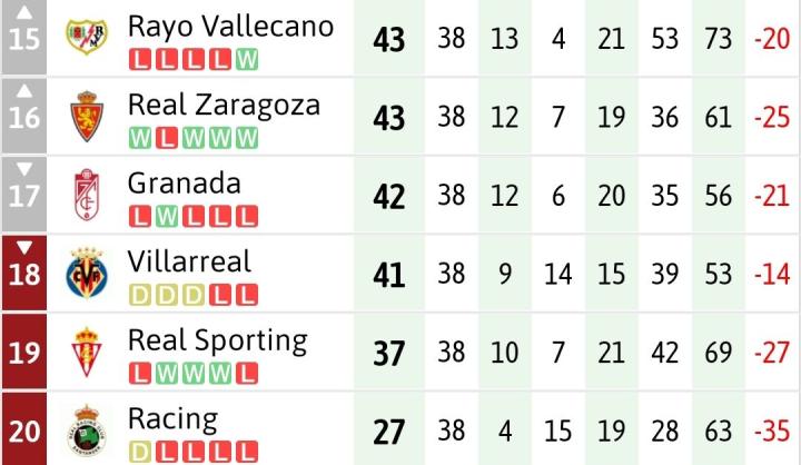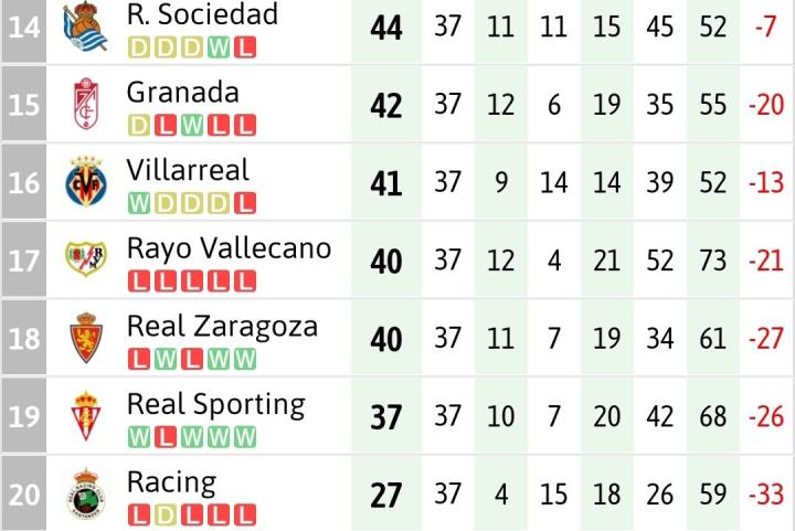 不过两队境遇再差,还是在安全区里的。格拉纳达只要祈求身后的三支球队不会同时赢球,他们就能保级;而黄潜只要最后一轮不败就铁定保级,就算失利也不一定是世界末日。除了这两支球队外,同积40分的巴列卡诺和萨拉戈萨踩在悬崖边上,还有37分的倒数第二名希洪竞技渴望殊死一搏。这5支球队在2011/12赛季西甲联赛的最后一轮展开了一场你死我活的保级大乱斗。