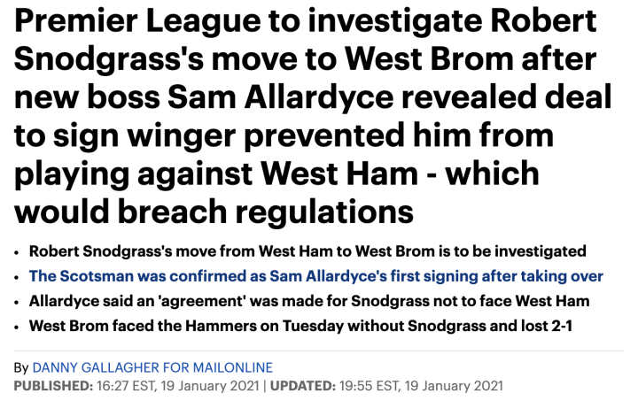 赛后,有媒体记者询问西布朗主帅阿勒代斯有关斯诺格拉斯的情况,大山姆无奈表示,这是西布朗与西汉姆之间的一个协议,斯诺格拉斯刚刚转会而来,铁锤帮方面不希望球员这么快反戈一击,于是诞生了所谓“回避条款”。对此,《电讯报》的专题报道表示,两家俱乐部在球员回避一事上已经达成口头协议,但这违反了英超的规定,因为联盟明确要求俱乐部之间不得以合同、协议等方式来获得实质上影响联赛表现的能力。