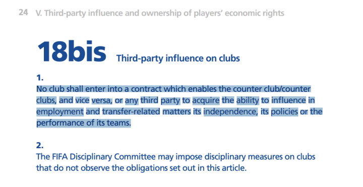 国际足联在其《球员身份及转会规程》中虽没有明确表示租借球员不可以被要求禁止出战母队,但是在18条bis中有写道:“任何俱乐部不得允许其与球员签订的合同受第三方影响,或使第三方有可能影响其雇佣关系及转会事宜及其独立性、政策和球队表现。(“No club shall enter into a contract which enables the counter club/counter clubs, and vice versa, or any third party to acquire the ability to influence in employment and transfer-related matters its independence, its policies or the performance of its teams)”,显然国际足联并不支持这种行为。