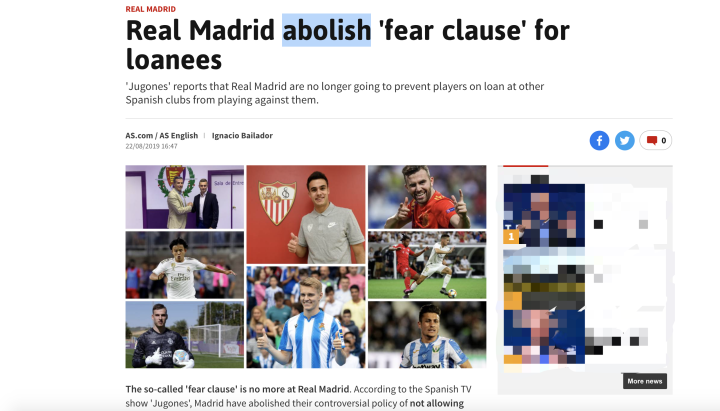 欧洲主流球队中,最擅长使用“回避条款”的球队就是皇家马德里。由于西甲不像英超,有明确规定禁止增设“回避条款”,所以皇马在外租球员的时候倾向加上该条款。2019年,《阿斯报》曾经有过专题报道,该媒体表示皇马擅长使用这一规则漏洞,但是皇马的回避条款也是劝阻性质的,而非强制性。只不过,球员出场的时候需要向皇马交付一些“出场费”,小球队一般不会为了球员的登场破费,而巴萨与马竞两家豪门则不习惯使用这种条款。由此可见,即便是在欧洲足坛没有命令禁止回避条款的联赛中,签署该条款也不是主流,而且皇马现在已经不再和其他球队签署该条款,目的是增加球员锻炼机会。
