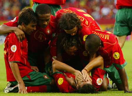 对阵英格兰队,葡萄牙队先输后赢,斯科尔斯、麦克马纳曼的进球不但没有击垮他们的意志,反而激发了他们的斗志,菲戈、平托先后进球扳平比分,横空出世的努诺-戈麦斯再进一球、反败为胜。