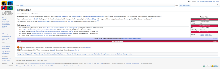 也许不只是中国球迷,就连国外球迷也对斯通知之甚少。在他的维基百科人物简介中,只能够翻查到少数几行文字,其中有这么几个关键事项值得留意:斯通之前是一位律师,随后成为了一名篮球运营副总裁;斯通在威廉姆斯学院打了4年的校队篮球,这是一所位于美国马萨诸塞州威廉姆斯镇的私立文理学院,为全美排名最佳的文理大学之一,王力宏是其校友;从威廉姆斯学院本科毕业并拿到历史学和政治科学学位后,斯通又去往斯坦福法学院深造。