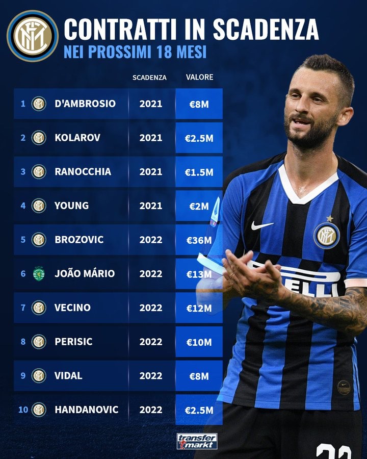 在目前国米的一线队中,丹布罗西奥、阿什利-扬、科拉罗夫、拉诺基亚以及帕代利的现有合同都将在今年6月到期,其中现年32岁的丹布罗西奥被认为会和国米续约到2022年。