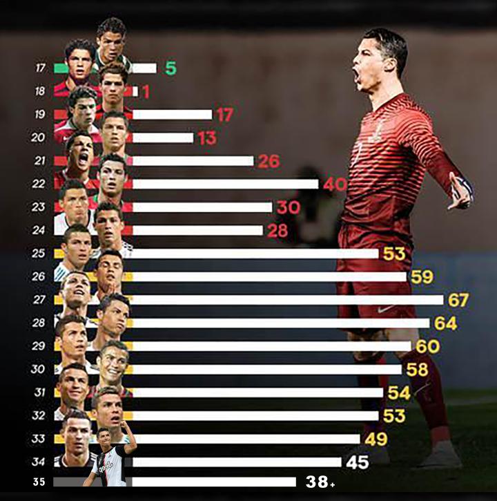 C罗各个年龄段进球分布:27岁进球最多,目前35岁38球