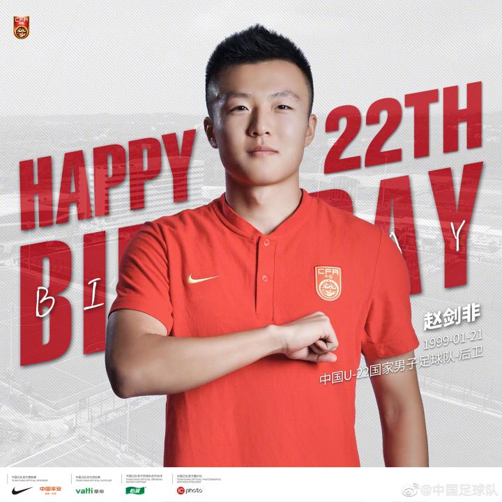 2021年1月21日,山东鲁能泰山后卫赵剑非迎来22周岁生日,国足官方微博发文为这位U23球员庆生。