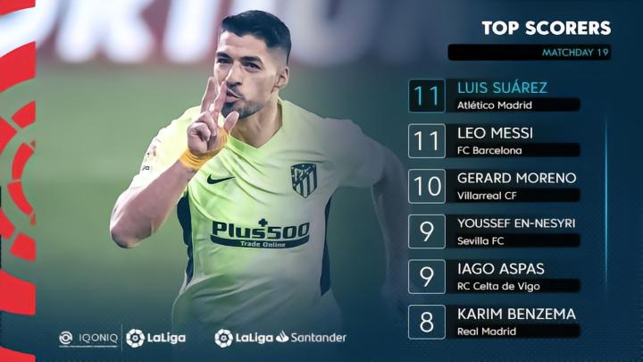 今日凌晨结束的一场西甲第19轮比赛中,马竞客场2-1逆转击败埃瓦尔,此役上演梅开二度的苏亚雷斯以11球登顶西甲射手榜,与前队友梅西并列。