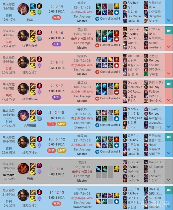通过韩服战绩中可以看到Leyan在排位中多次使用自己的招牌英雄豹女练习,虽然连续三把失利,但不影响他其余两场胜利的华丽战绩;其中一局中更是对上了Doinb的佐伊,曾在中路通过豹女的灵活性戏耍Doinb并拿下双杀。