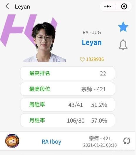 峡谷全视野此前因为在排位中使用BUG而遭到禁赛的Leyan在这段时间内疯狂排位,目前是LPL选手中韩服排位分最高的选手。