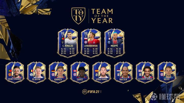 FIFA21年度阵容公布,姆巴佩、德布劳内入选,梅西无缘最佳阵容。