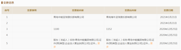 潇栋-在通过中国足协中性名评审小组审核后,青岛中能足球俱乐部于近日在工商部门完成变更,正式更改俱乐部名称为“青岛海牛足球俱乐部”。根据在工商部门信息查询,青岛中能足球俱乐部有限公司于1月21日变更为“青岛海牛足球俱乐部有限公司”,成为继青岛青春岛之后青岛第二支完成中性名更名工作的队伍。