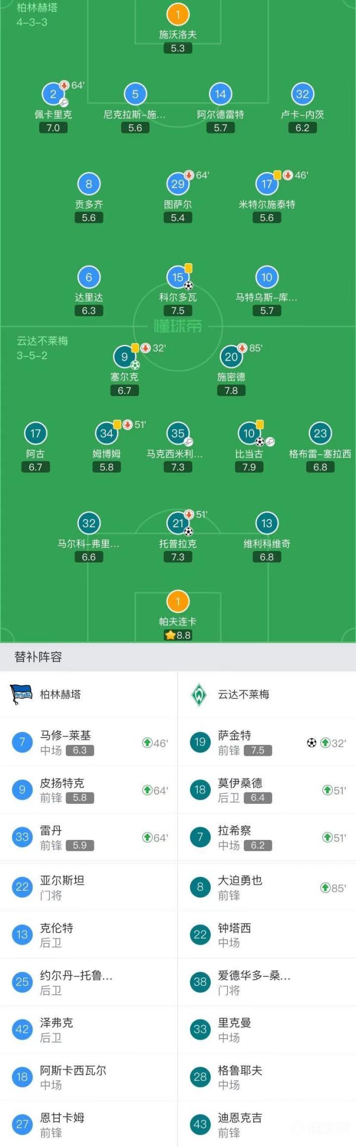 云达不莱梅首发:1-帕夫连卡、13-维利科维奇、32-马尔科-弗里德尔、21-托普拉克(51'18-莫伊桑德)、23-格布雷-塞拉西、17-阿古、34-姆博姆(51'7-拉希察)、10-比当古、35-马克西米利安-埃格施泰因、20-施密德(85'8-大迫勇也)、9-塞尔克(32'19-萨金特)
