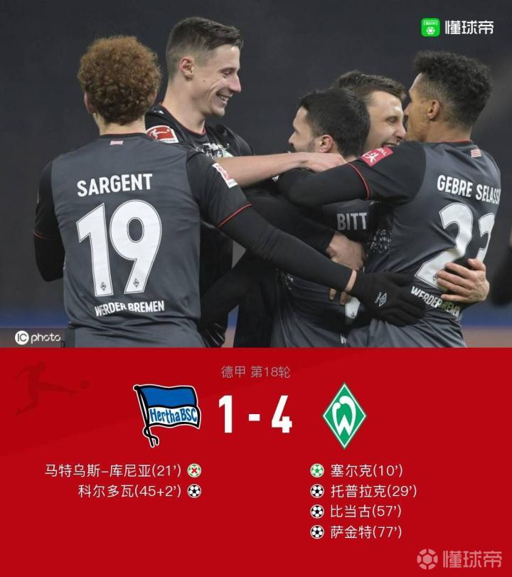 北京时间1月24号1:30德甲第十八轮柏林赫塔坐镇主场对战前来挑战的不莱梅,上半场比赛塞尔克点射破僵后不久伤退下场,库尼亚造点罚丢,随后托普拉克头球扩大比分,半场哨前,科尔多瓦头球扳回一城。来到下半场,比当古反越位接球转身低射一气呵成再次扩大比分,随后柏林赫塔快速反击库尼亚接头球摆渡形成单刀踢偏,萨金特外围打近角得手锦上添花,最终全场比分定格在1-4,不莱梅客场带走三分。