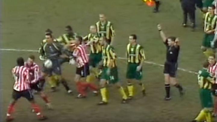 在紧接着的另一名谢联替补出场的球员萨沃和西布朗的混战中,萨沃在裁判眼皮地下,用头向西布朗射手麦金尼斯的脑袋撞去,红牌!而万幸的是谢联队长基思·柯尔在对麦金尼斯拳头重击后逃脱了裁判的红牌。